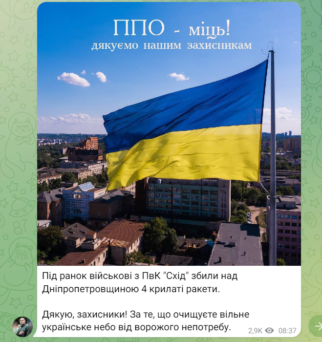 Под утро военные из ПвК “Схід” сбили над Днепропетровщиной 4 крылатые ракеты. Спасибо, защитники! За то, что очищаете свободное украинское небо от вражеского хлама, – написал он.