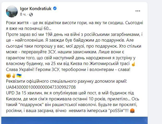 О неприятном инциденте ведущий рассказал на своей странице в Фейсбуке. По его словам, в дом под Киевом, в котором он с семьей жил последние десять лет прилетел вражеский снаряд. Случилось это за 15 минут того, как он опубликовал пост в честь своего дня рождения и попросил перечислить деньги на нужды ВСУ.