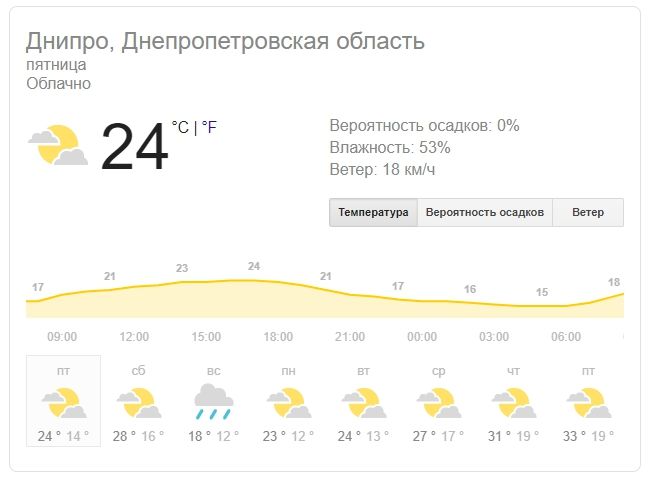 По прогнозу синоптиков, ближайшие 5 дней в Днепре температура воздуха продержится в пределах 18 — 28 градусов, ночью - 13 - 17 градусов.
