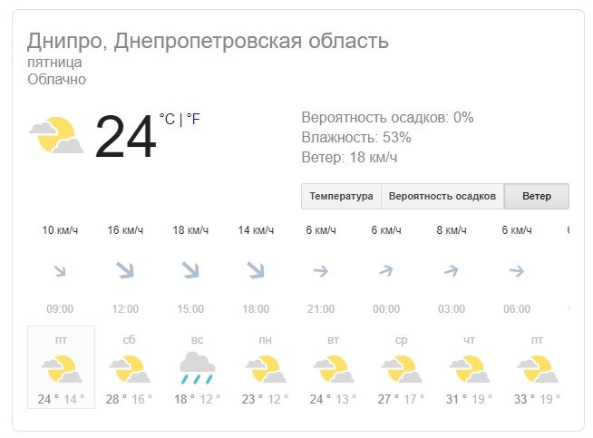 На протяжении всего дня небо в Днепре будет покрыто облаками. Без осадков. Днем столбик термометра покажет 23 — 24 градусов. Температура воздуха ночью — 15 — 16 градусов. Порывы ветра до 3-4 м/сек.