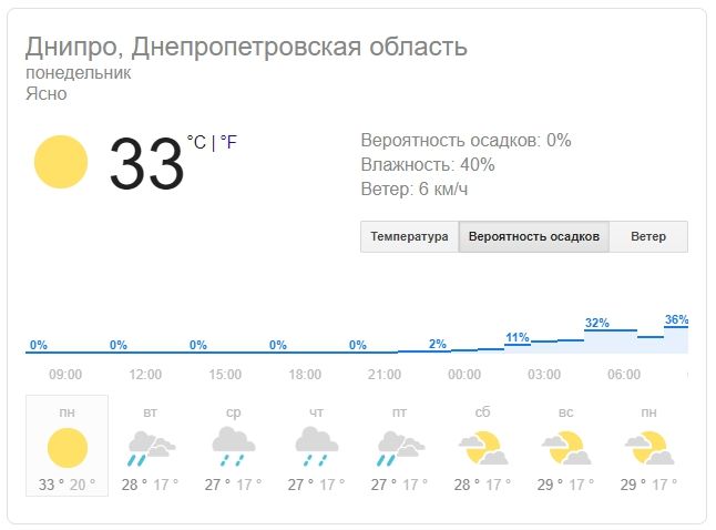 По прогнозу синоптиков, ближайшие 5 дней в Днепре будет дождить, температура воздуха продержится в пределах 27 — 28 градусов, ночью - 17 - 18 градусов.