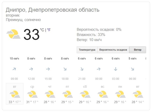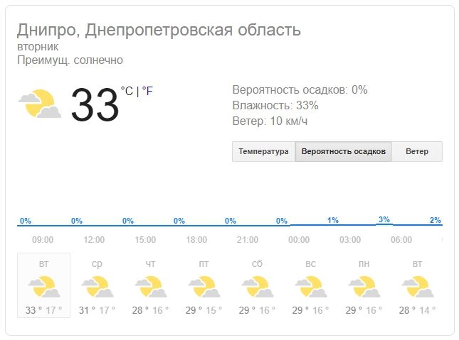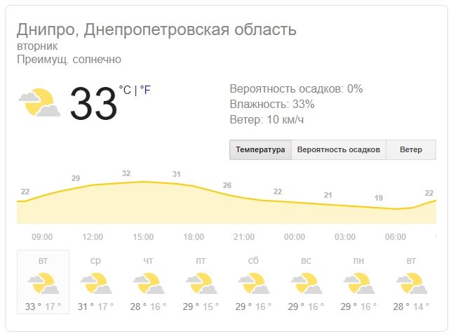 Весь день небо в Днепре будет ясным. Днем столбик термометра покажет 32 — 33 градуса. Температура воздуха ночью — 17 — 19 градусов. Порывы ветра 5-10 м/с. Без осадков.