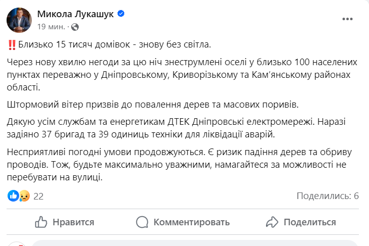 Штормовой ветер привел к падению деревьев и массовым обрывам. Спасибо всем службам и энергетикам ДТЭК Днепровские электросети. В настоящее время задействовано 37 бригад и 39 единиц техники для ликвидации аварий, – написал Лукашук.