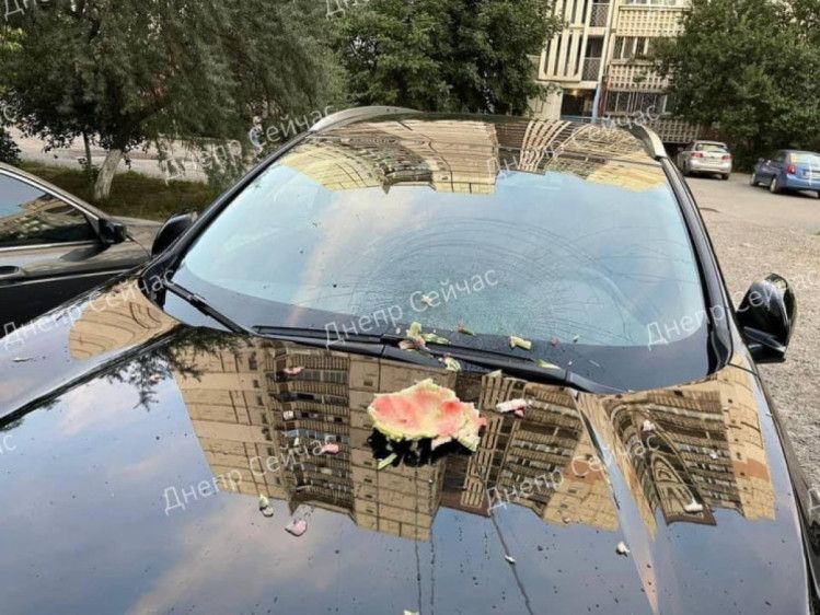 Трагикомическая ситуация произошла в Днепре на проспекте Мира, 49. Неизвестный выбросил из окна арбуз. Он упал на припаркованную под домом машину. Иномарка осталась без лобового стекла и со вмятиной на капоте. Возможно, сосед просто хотел угостить автомобилиста летней ягодой.