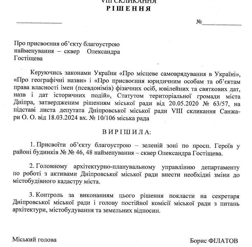 Ранее городской голова Днепра Борис Филатов сообщал, что одну из улиц города хотят назвать именем Александра Гостищева - командира полка "Цунами", погибшего во время ракетного удара в Одессе, 15 марта.