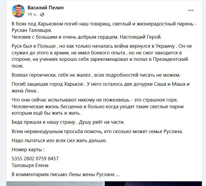 К сожалению, подтвердилось страшное - Руслан погиб. У него остались жена Елена и две дочери - Александра и Мария. Если вы хотите помочь семье то реквизиты: 5355 2802 0759 8457 - Таловыря Елена