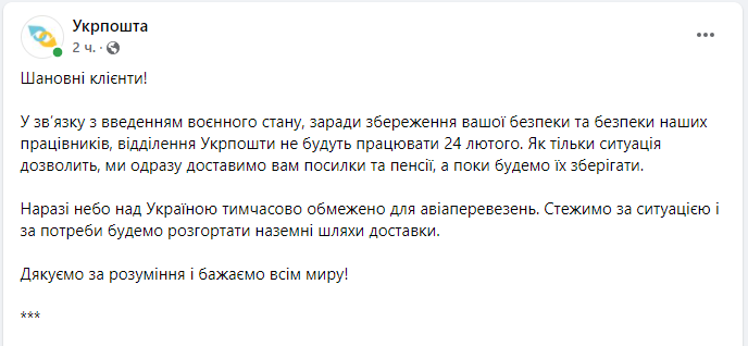 "В связи с введением военного положения, ради сохранения вашей безопасности и безопасности наших работников отделения "Укрпочты" не будут работать 24 февраля. Как только ситуация позволит, мы сразу доставим посылки и пенсии, а пока будем их хранить", - говорится в сообщении.