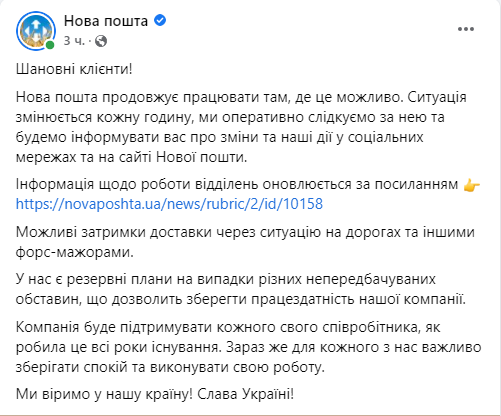 "Новая почта" продолжает работать там, где это возможно. Ситуация меняется каждый час, мы оперативно следим за ней и будем информировать вас об изменениях и действиях в социальных сетях и на сайте "Новой почты", - пишут на ФБ-странице компании.