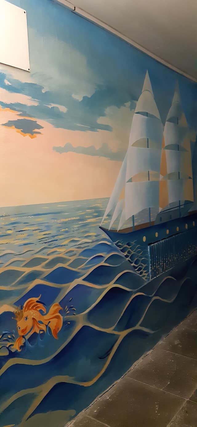 «Сегодня были опубликованы картины в арках дома 15, написанные художницей Лизой. А в доме 60 в одном из подъездов на 6 этаже есть тоже работа Лизы. Так жители этажа украсили свое жилище. А Лиза воплотила в жизнь их желание. Теперь, выходя из лифта, все попадают на чудесный корабль, развевающий свои паруса. А при желании можно слегка погладить Золотую рыбку и загадать желание. Спасибо художнице», - написано в сообщении в соцсетях.
