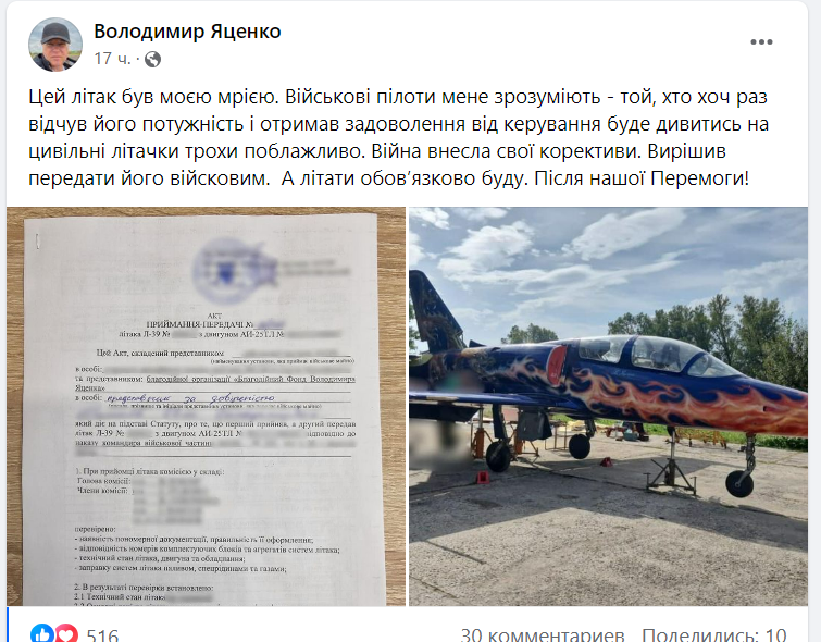 Предприниматель с Днепропетровщины и соучредитель Monobank Владимир Яценко передал на нужды Вооруженных сил Украины свой самолет - Л-39 "Альбатрос".
