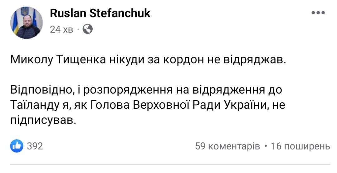 Председатель Верховной Рады Руслан Стефанчук рассказал, разрешал ли Николаю Тищенко выезжать в Таиланд.