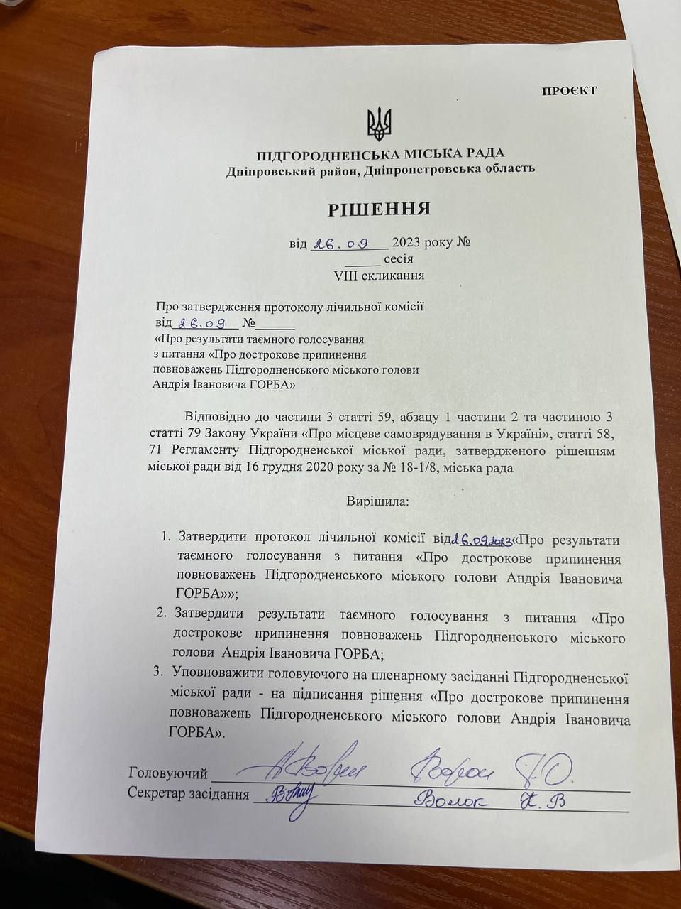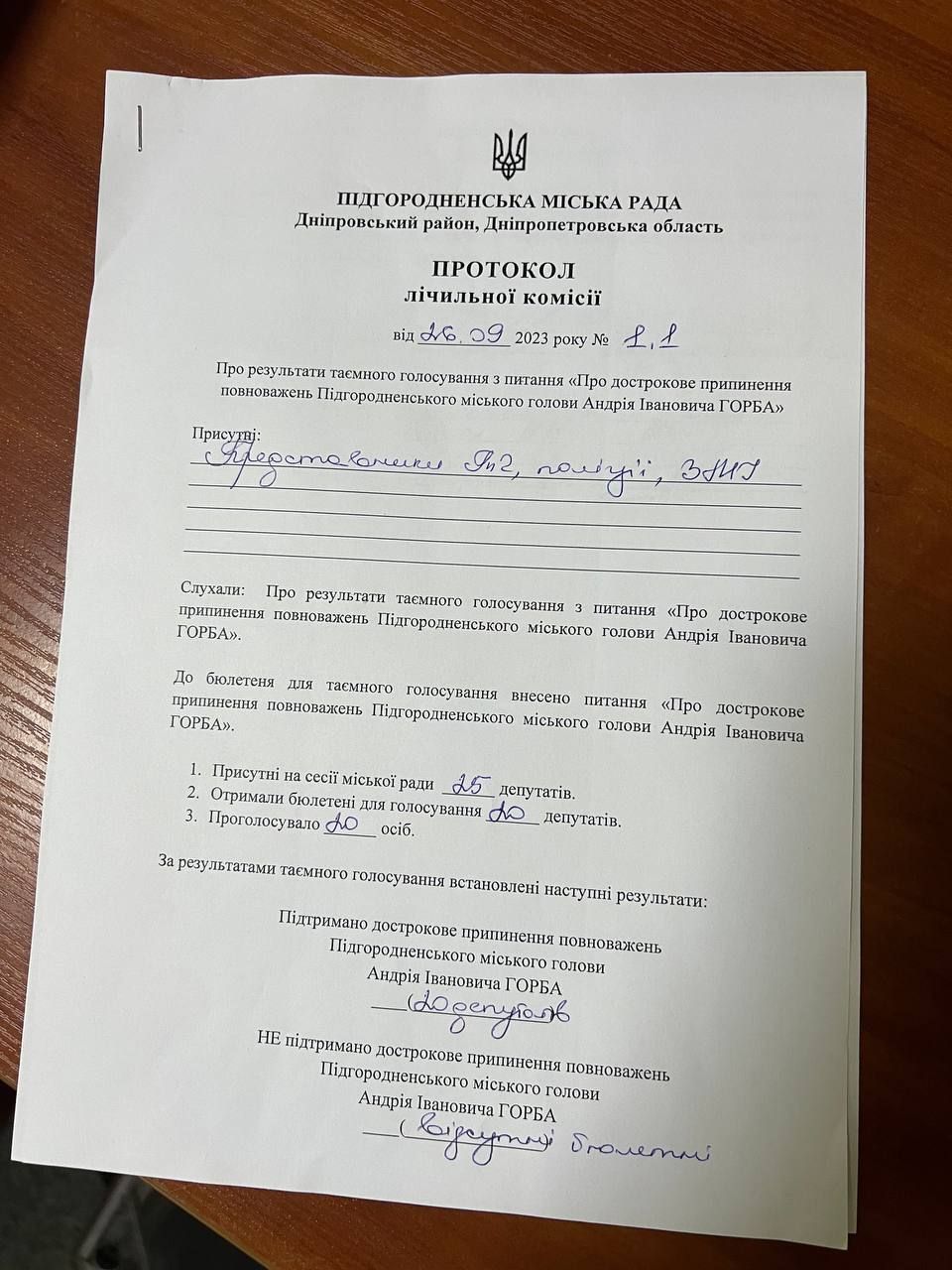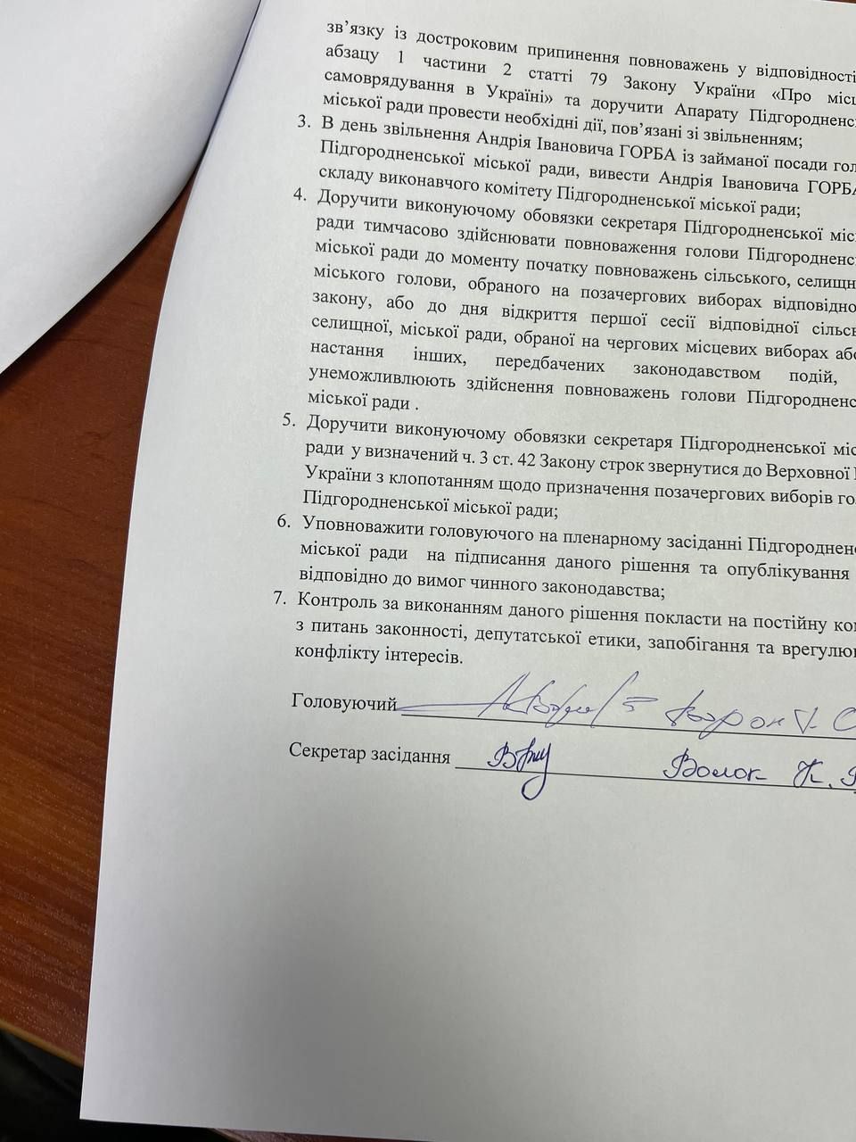 Поэтому депутаты Подгородненского городского совета избрали председательствующего среди присутствующих. Оставаясь в сессионном зале, они под председательством депутата Романа Ворона добавили в повестку дня два вопроса: об отстранении Андрея Горба и отстранении секретаря городского совета. После этого депутатский корпус наконец-то смог проголосовать.