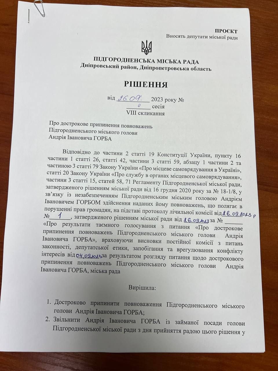 Председателя Подгородненской городской ОТГ Андрея Горба отстранили от должности