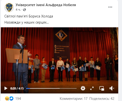 Холод Борис Иванович — основатель и президент Университета имени Альфреда Нобеля. Заслуженный деятель науки и техники Украины, доктор экономических наук. 1999-2000 году был заместителем Министра образования и науки Украины. Из 2000 по 2004 год был Главой Национального совета Украины по вопросам телевидения и радиовещания. Активно занимался научной деятельностью. Ему было 80 лет.