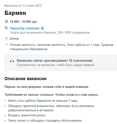 Работая барменом в аквапарке можно заработать от 12 до 16 тыс грн. При этом нужно иметь опыт работы от года, быть вежливым, доброжелательным и отработать не менее 15 смен в месяц. График работы плавающий, зарплата выплачивается два раза в месяц, а в свой выходной сотрудник может бесплатно посетить аквапарк.