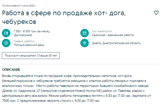 Продавец кофе, пирожков, чебуреков и хот-догов с беляшами может заработать от 7,5 до 8,5 тыс грн в месяц. Вакансия предполагает наличие опыта работы, но возможно повезет и тем, кто готов стараться и учится. Точка продажи находится в отдельном павильоне, неподалеку от вокзала. Работать нужно будет с 8:30 до 17:00, пять дней в неделю.