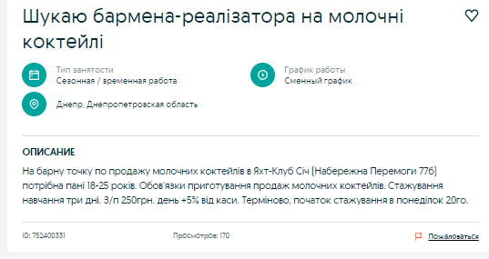 Реализатор молочных коктейлей может заработать от 250 грн в день плюс 5% от выручки. Среди обязанностей – приготовление напитка. Точка продажи находится в бойком месте, неподалеку от одного из скверов Днепра.