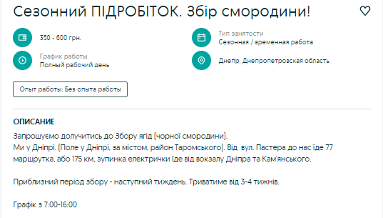 Сборщик ягод может получать от 350 до 600 грн в день. Сезон сбора будет длится от 3 до 4-х недель, график работы с 7:00 до 16:00. Трудоустройство официальное, по договору. Собирать нужно будет смородину.