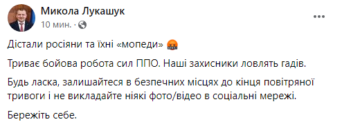 "Достали россияне и их "мопеды". Продолжается боевая работа сил ПВО. Наши защитники ловят гадов", - написал Лукашук.