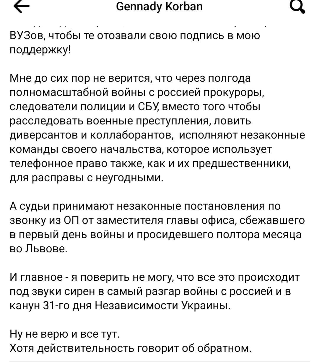 находит где-то время, чтобы обзванивать ректоров ВУЗов, чтобы те отозвали свою подпись в мою поддержку!Мне до сих пор не верится, что через полгода полномасштабной войны с россией прокуроры, следователи полиции и СБУ, вместо того чтобы расследовать военные преступления, ловить диверсантов и коллаборантов, исполняют незаконные команды своего начальства, которое использует телефонное право также, как и их предшественники, для расправы с неугодными.