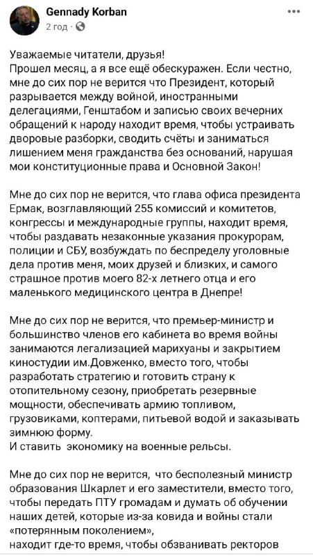 На своей странице в Фейсбуке Геннадий Корбан прокомментировал действия властей, которые касались лишения его гражданства. Он заявил, что до сих пор не верит, что такое могло произойти, особенно учитывая войну в Украине, но действительность свидетельствует о другом.
