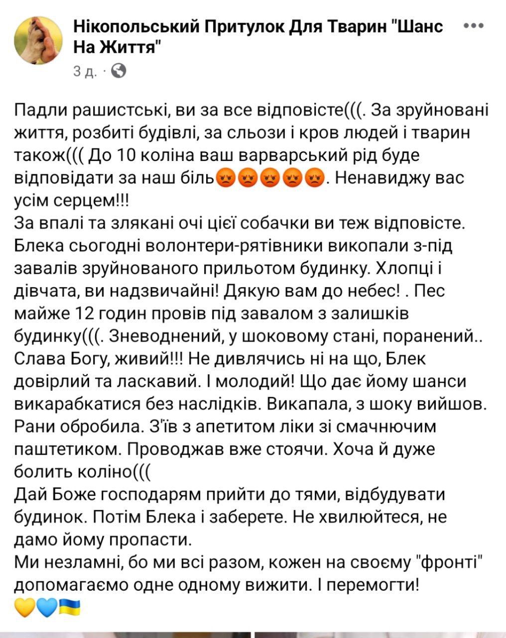 Під час чергового обстрілу Нікополя обвалилася частина будинку. Під завалами опинився улюбленець сім'ї пес Блек. У пастці він провів майже 12 годин, поки звідти його не витягнули волонтери-рятувальники. Собака був знесилений і дуже наляканий.