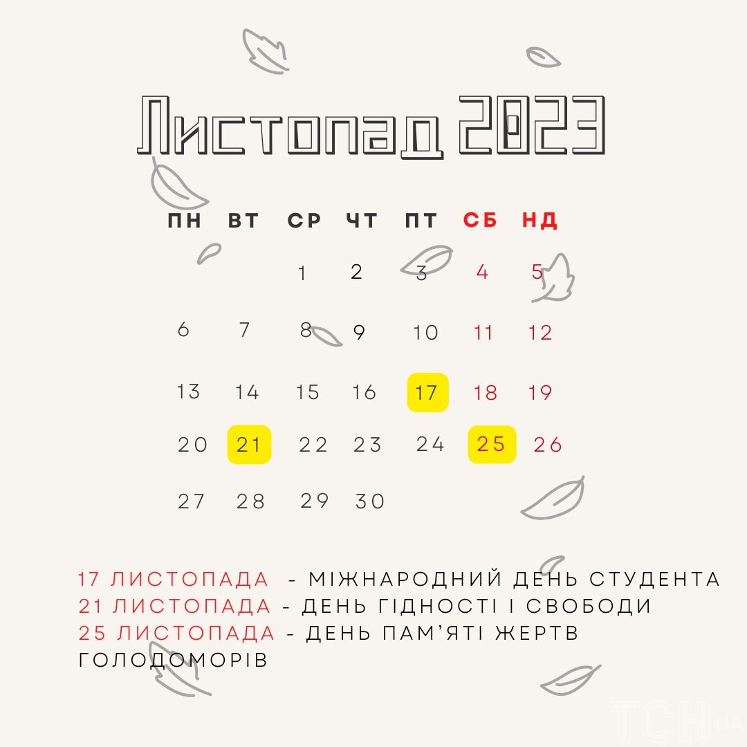 В последний месяц осени украинцев будет ждать Международный день студента (17 ноября). Также мы будем праздновать многие профессиональные праздники: День ракетных войск и артиллерии Украины (3 ноября), День железнодорожника Украины (4 ноября), День работников радио, телевидения и связи Украины (16 ноября), День работников сельского хозяйства Украины (19 ноября).