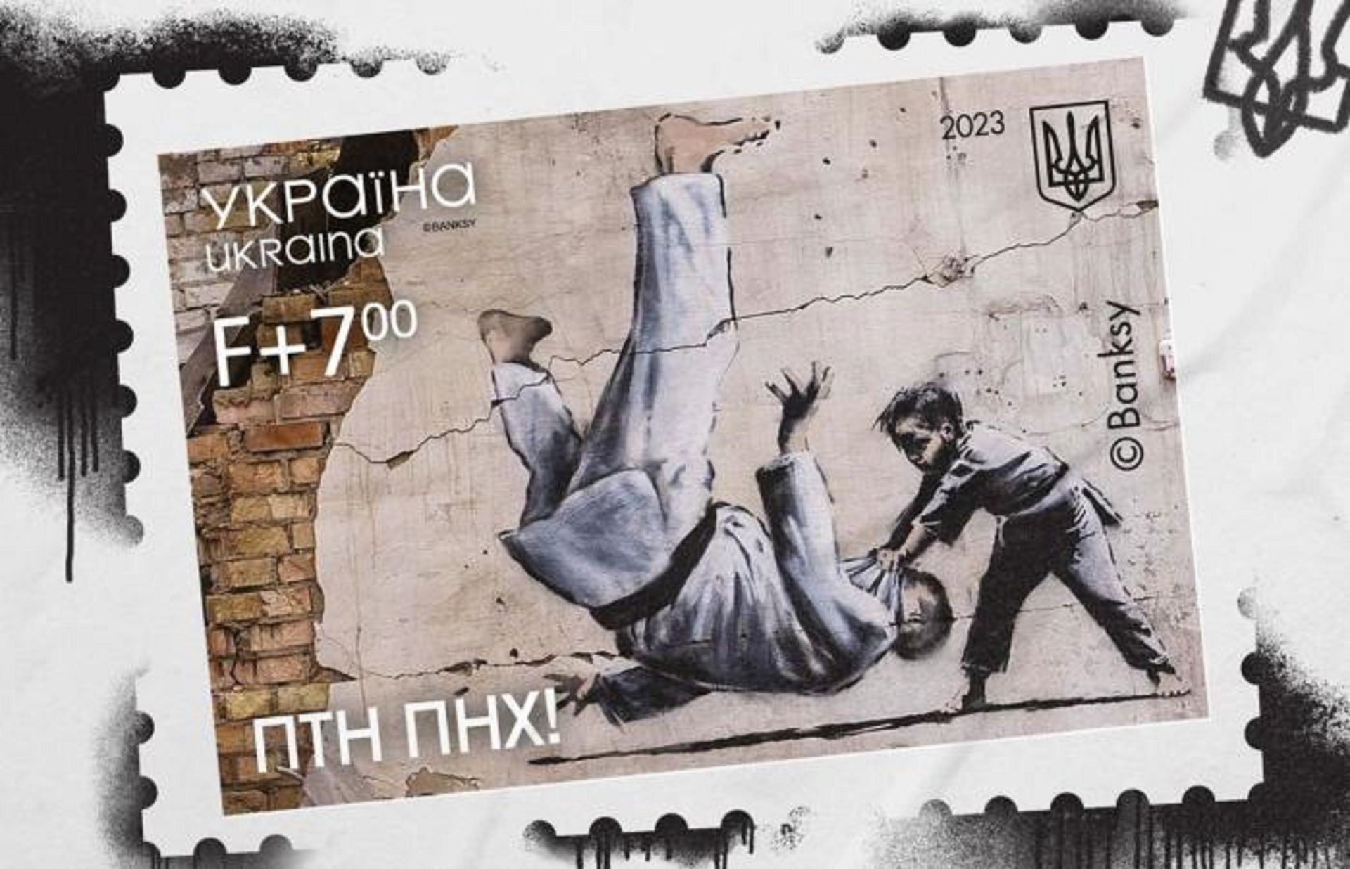 Новая марка "Укрпочты" называется "ПТН-ПНХ" и посвящена годовщине российского вторжения. В дизайне использовали граффити всемирно известного стрит-артера Бэнкси, которое он оставил на стене дома в Бородянке.