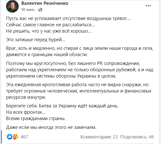 "Пусть вас не успокаивает отсутствие воздушных тревог - это затишье перед бурей", - Резниченко
