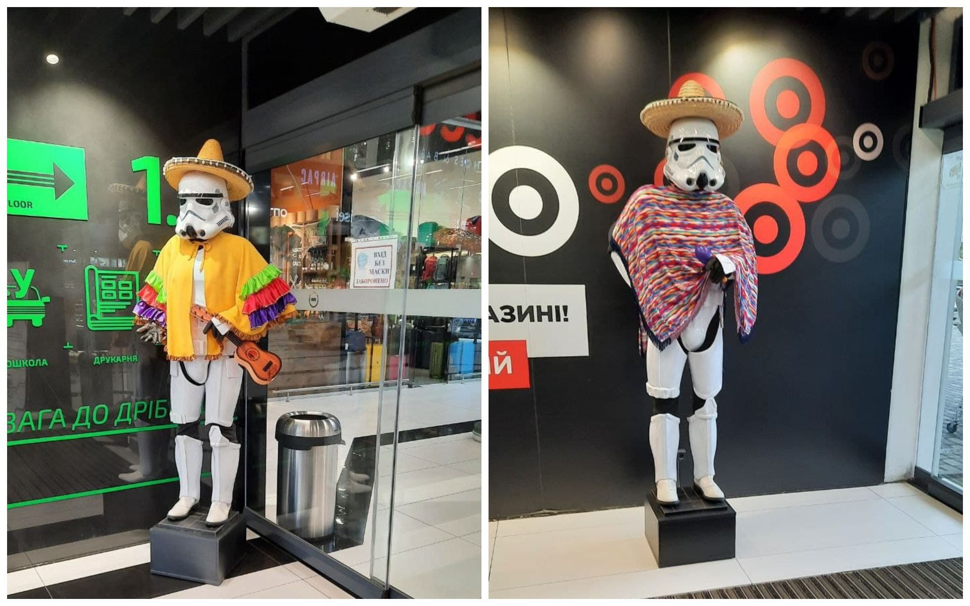 В торговом центре активно готовятся к Хеллоуину. На выходных там пройдут мероприятия посвященные этому празднику. Вход в ТЦ охраняют штурмовики, которых работники одели в мексиканские шляпы и сомбреро.