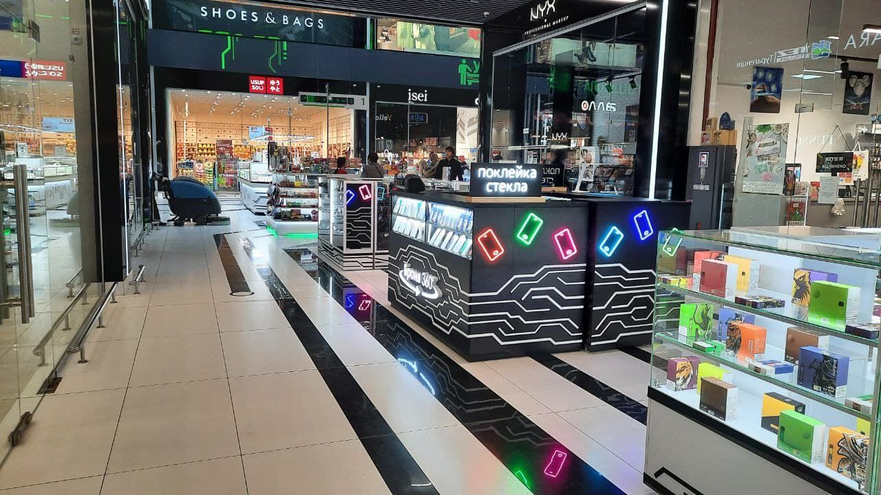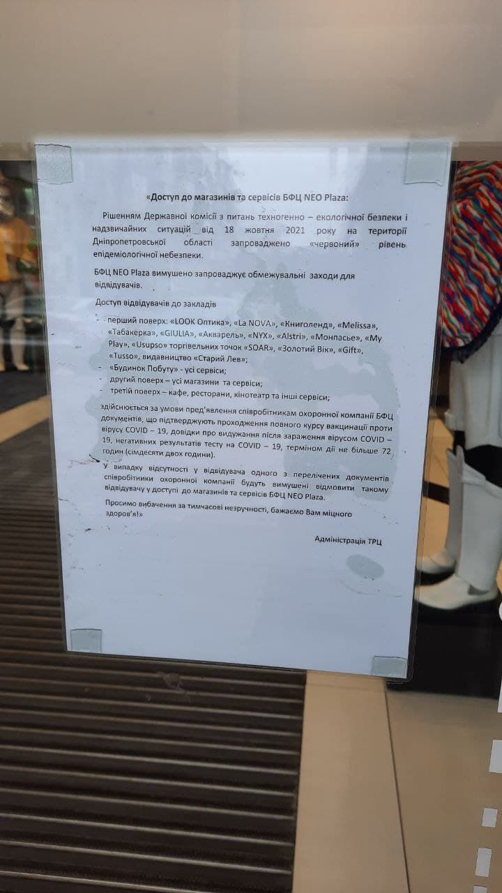На входе висит объявление, где администрация торгового центра предупреждает о новый ограничениях. В список магазинов, куда не пускают сертификата вошли непродовольственные точки продаж. На первом этаже без документа о вакцинации не пустят в оптику, книжный, табачный, канцелярский и ювелирный. На втором и третьем этаже не пускают во все магазины и кафе.