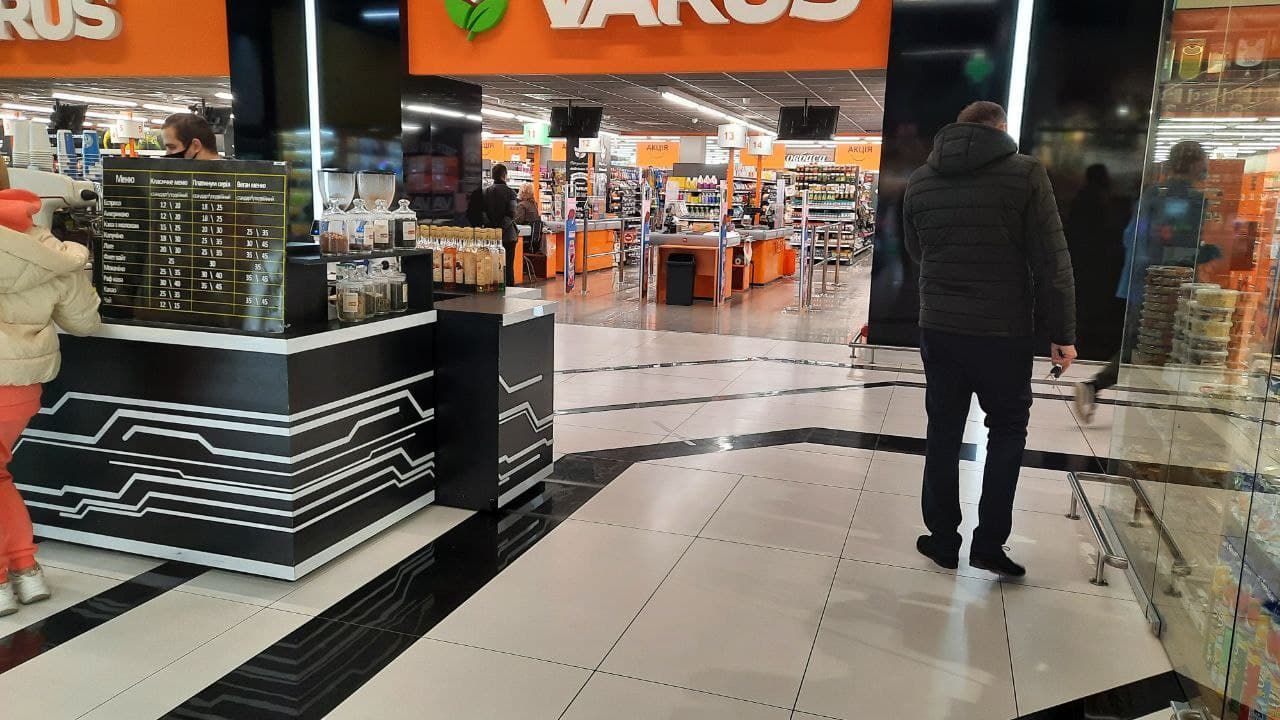 Оживленнее всего на первом этаже возле супермаркета "Варус". В самом продуктовом, как для одиннадцати часов утра, ситуация обычная. Почти все кассы свободны, а в среди торговых рядов ходят покупатели. Возле магазина расположена точка, где продают кофе. Здесь женщина забирала свой напиток. Правда не ясно, спросил ли у нее кассир перед оплатой товара сертификат.