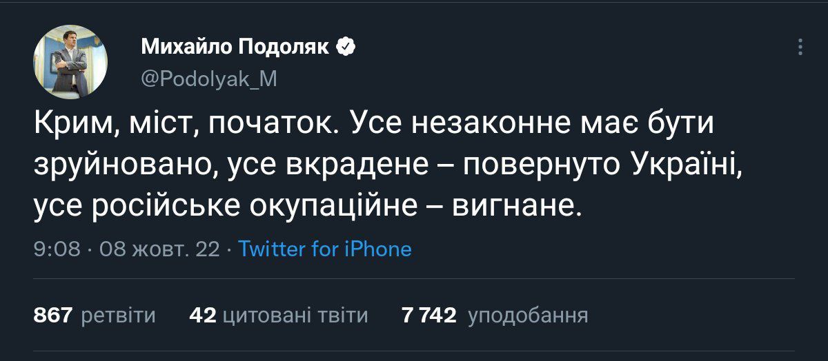 Михаил Подоляк тоже прокомментировал горящий мост. И намекнул, что это только начало.