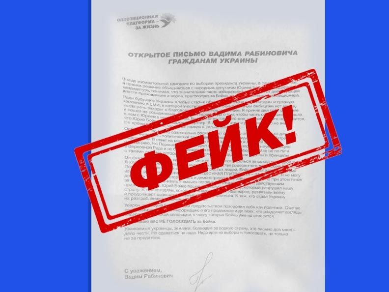 Жители украинских городов стали получать по почте фейковые письма якобы от Вадима Рабиновича, в которых он обвиняет Юрия Бойко в расколе оппозиции и призывает не голосовать за него на президентских выборах. Это свидетельство того, что власть боится единственного реального кандидата от оппозиции.