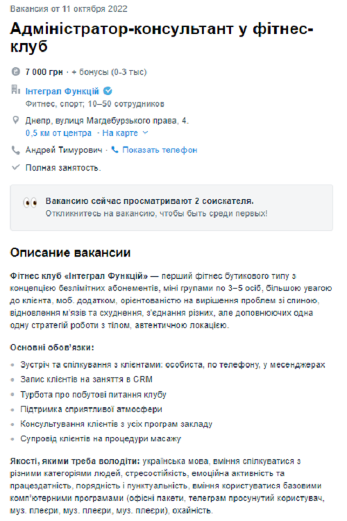 Администратор фитнес клуба, который будет записывать клиентов, решать бытовые проблемы заведения, записывать любителей спорта на занятие и консультировать их по всем программам клуба может получать 7 тыс грн в месяц. От соискателя требуется умение общаться с разными категориями людей, стрессоустойчиковсть, эмоциональная активность, пунктуальность, умение пользоваться базовыми офисными программами, среди которых музыкальный плеер. В неделю нужно будет выходить на работу 4-6 раз. Обещают постепенное увеличение зарплаты, обучение, возможность пользоваться спортзалом.