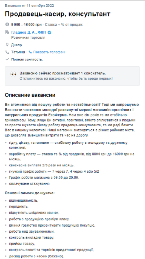 В 9-16 тыс грн оценивают в Днепре работу продавца-консультанта в магазине. В качестве «бонусов» обещают процент от продажи товара. От соискателя требуется отсутствие вредных привычек, порядочность, умение грамотно презентовать продукцию покупателю, контроль выкладки товара, его прием и «слежку» за качеством и сроком годности продукта. Желателен опыт работы с кассой.