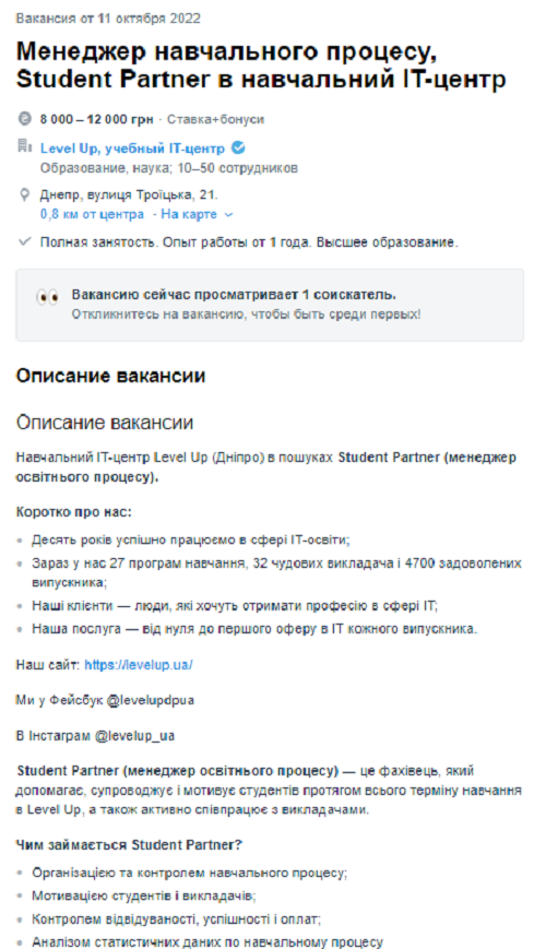 Менеджер образовательного процесса может получать от 8 до 12 тыс грн. От соискателя ожидают понимания что такое IT бизнес, его особенности, опыт публичных выступлений и работы HR. Помимо зарплаты будущему работнику предлагают скидку на обучение, спортзал прямо на рабочем месте и возможность бесплатно посещать разные образовательные мероприятия и выступать на них. На самом рабочем месте нужно будет заниматься организацией и контролем учебного процесса, посещаемости и оплаты, а также мотивировать студентов и преподавателей.