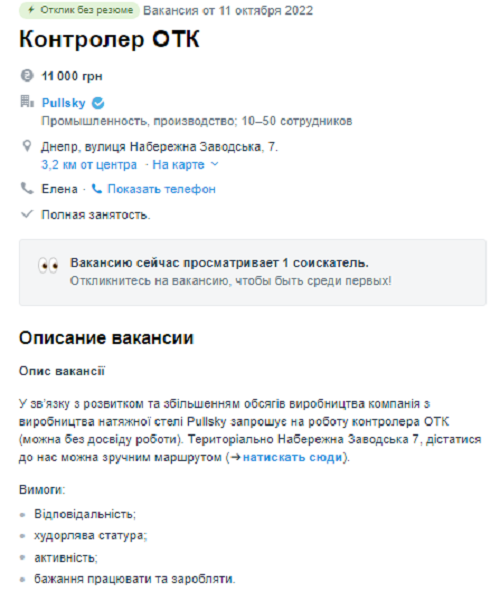 Столько же может заработать контролер ОТК на промышленном предприятии. Работать нужно будет в цеху, главная задача – проверка качества готовой продукции. Опыта не требуется, обещают научить.
