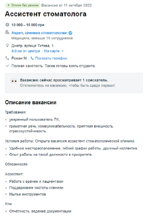 От 10 до 15 тыс грн может заработать за месяц помощник стоматолога. Для получения должности нужно уверенные знания ПК, грамотная речь, стрессоустойчивость. Среди обязанностей – поддержание чистоты клиники, мытье инструментов, ведение отчетности.