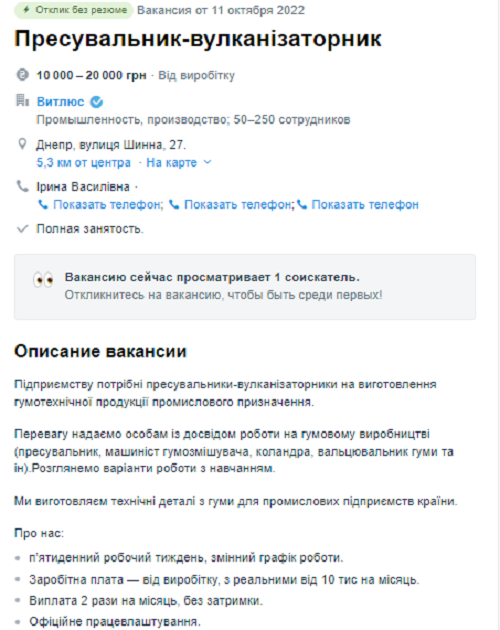 От 10 до 12 тыс можно заработать в Днепре трудясь на должности пресовщика-вулканизатора. Для этой работы нужно иметь профильный опыт. Трудится нужно будет 5 дней в неделю, график работы сменный.