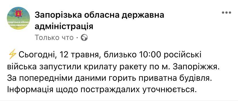 "Сегодня, 12 мая, около 10:00 российские войска запустили крылатую ракету по г. Запорожье. По предварительным данным, горит частное здание. Информация о пострадавших уточняется", - говорится в сообщении ЗОВА.