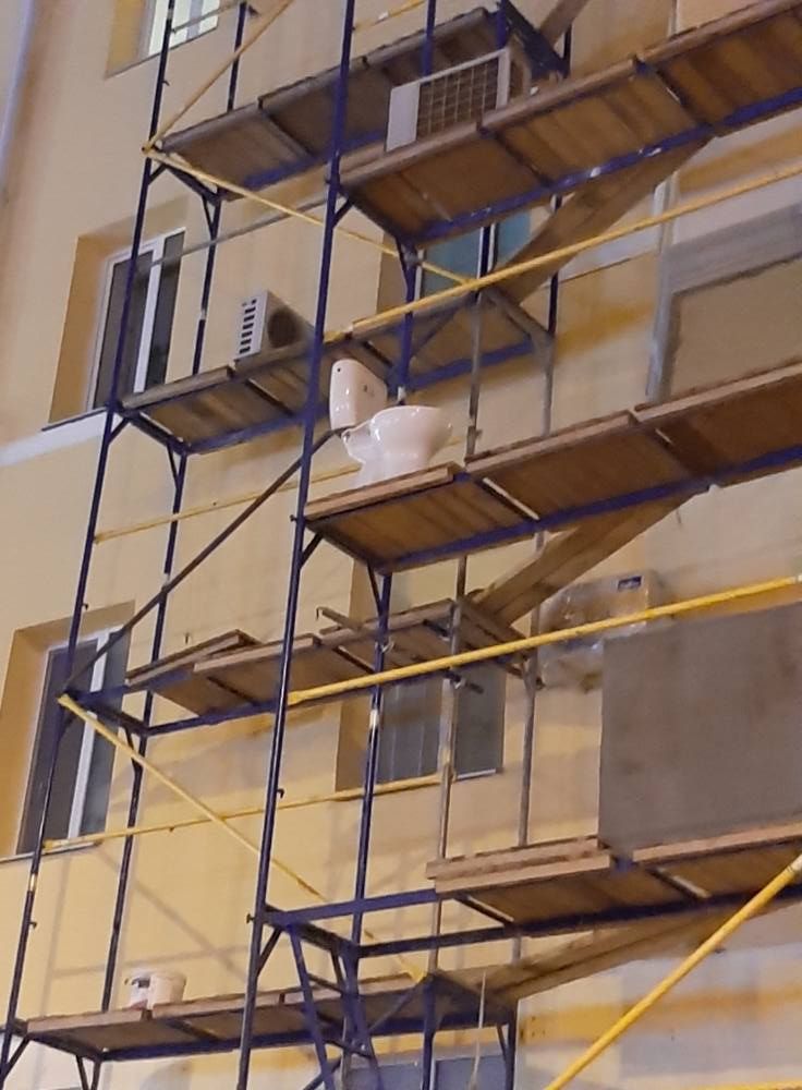 Пока предназначение унитаза на строительных лесах не известно. Остается только надеяться, что он оттуда не упадет и не покалечит никого.