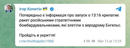 Предварительно, есть информация о запуске в 13:16 крылатых ракет российскими стратегическими бомбардировщиками, взлетевшими с аэродрома Энгельс, сообщил нардеп и член комитета ВР по нацбезопасности Игорь Копытин.