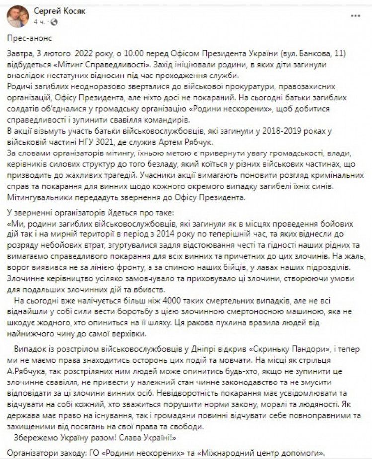 Участие в митинге примут также родители солдат, погибших в полку Нацгвардии Днепра в течение 2018-2019 годов. Расследование этих смертей продолжается.