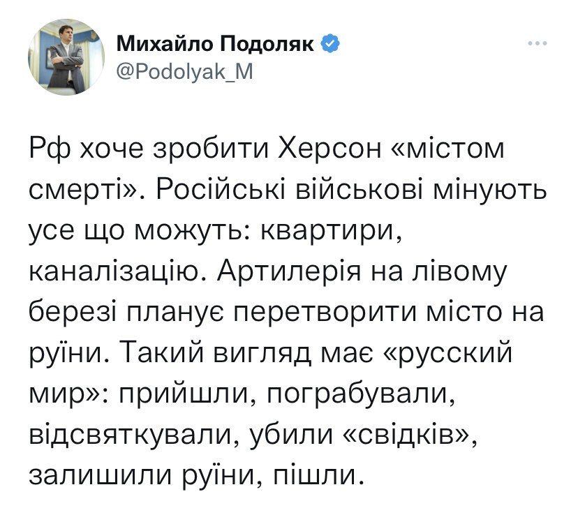 Советник главы Офиса президента Михаил Подоляк прокомментировал события вокруг Херсона. По его словам, российские военные сейчас минируют все: от квартир до канализации. А отступив – будут бить по правобережью из артиллерии.