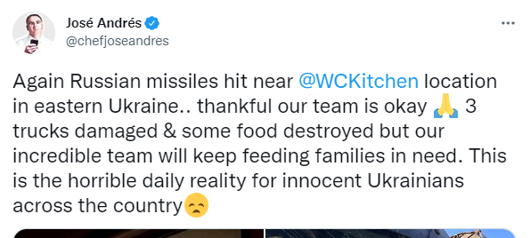 Три грузовика повреждены, часть еды уничтожена, но наша невероятная команда будет продолжать кормить нуждающиеся семьи. Это ужасная ежедневная реальность для невинных украинцев по всей стране, – написал Андрес в Twitter.