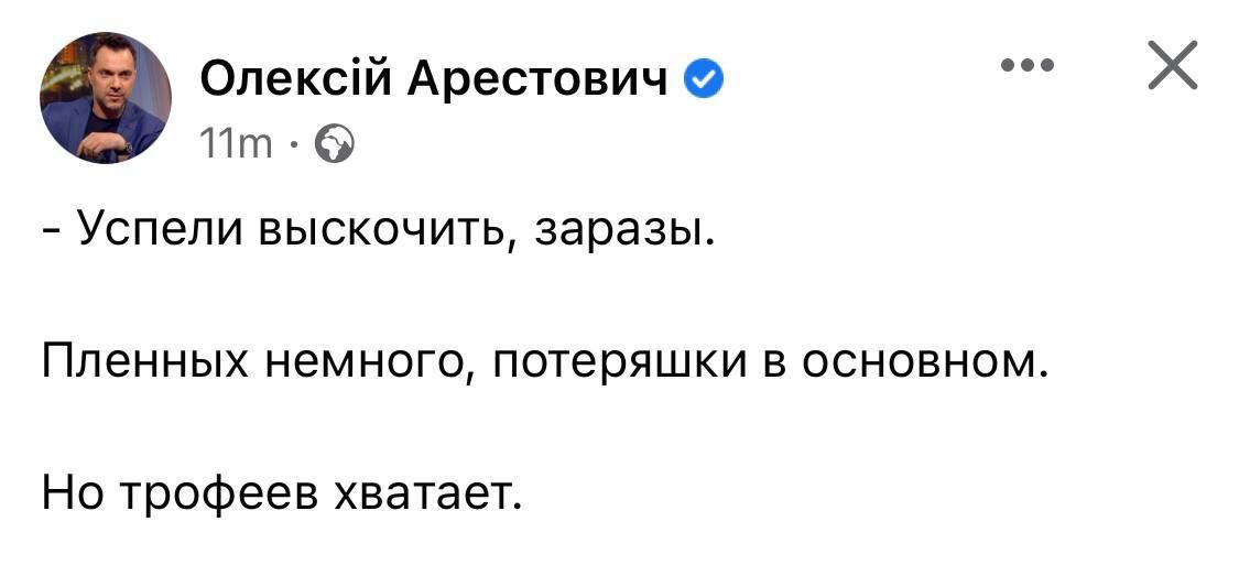 Российские подразделения на правом берегу успели сбежать. По словам Алексея Арестовича, пленных немного, в основном это те "кого забыли". Но он заверил, что есть трофеи.