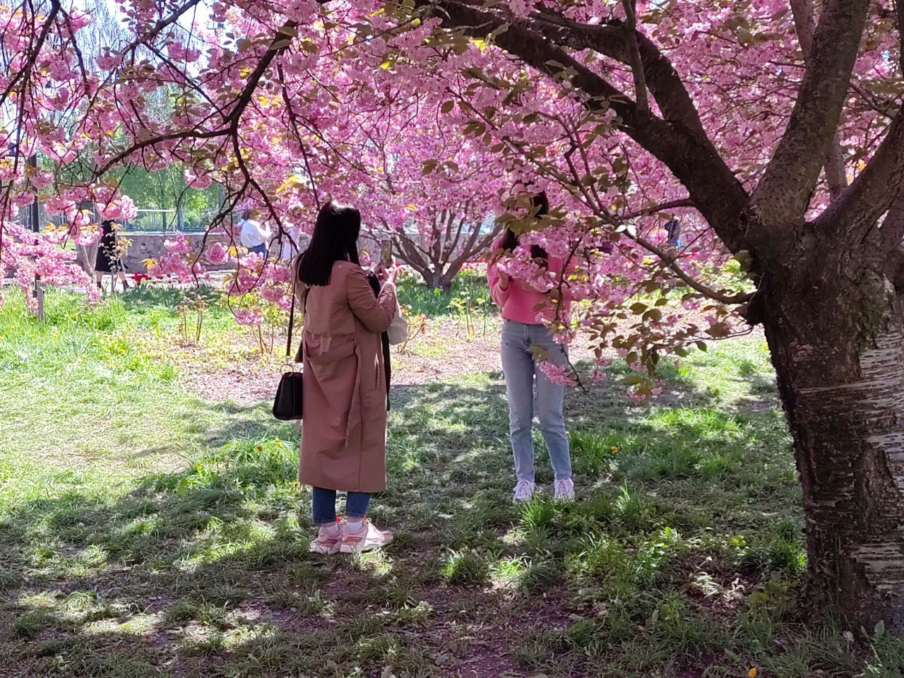 Они фотографируются на фоне распустившихся цветков, рассматривают соцветия, делают селфи и обсуждают красоту сакур.