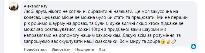 Дорогие друзья, никого не хотели ни обидеть, ни испугать. Это моя закусочная на колесах, ищем место, где можно было бы стать и работать. Мы не первый год делаем шаурму на дровах, и были бы очень благодарны, если кто-нибудь подскажет, где можно расположиться, каждые 10 грн из приобретенной вами шаурмы мы направляем на помощь нашим защитникам. Спасибо всем за понимание, и приглашаем вас отведать наши вкусности. Всем мира и добра, - отмечает Александр.
