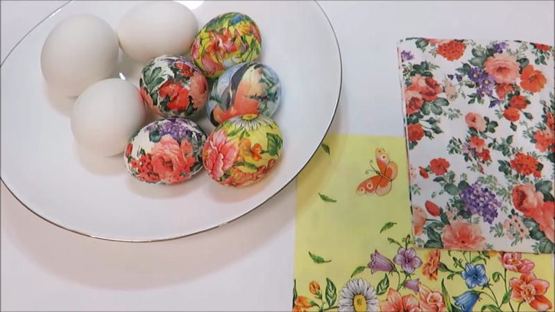 Вам понадобятся бумажные салфетки с красивым узором. К смазанному обычным белком яйцу приложите вырезанный элемент салфетки и приклейте его с помощью рук или кисточки. Сверху еще раз покройте приклеенный фрагмент белком, аккуратно нанося клейкую массу от середины салфетки, приложенной к поверхности яйца, к краям.